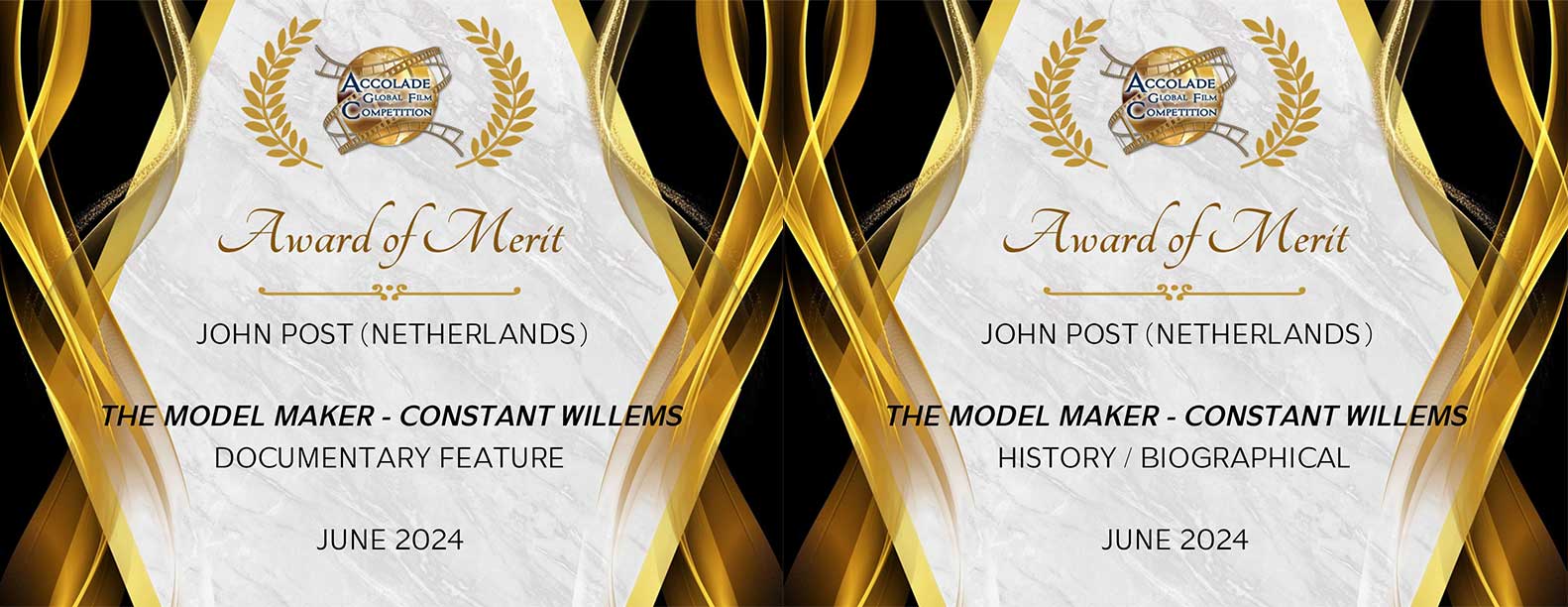Met trots kondig ik hier aan dat de documentaire 'De Maquettebouwer - Constant Willems' twee prestigieuze Accolade Awards of Merit heeft gewonnen! De documentaire heeft de prijs voor Documentary Feature én een award in de categorie History/Biographical in de wacht gesleept.