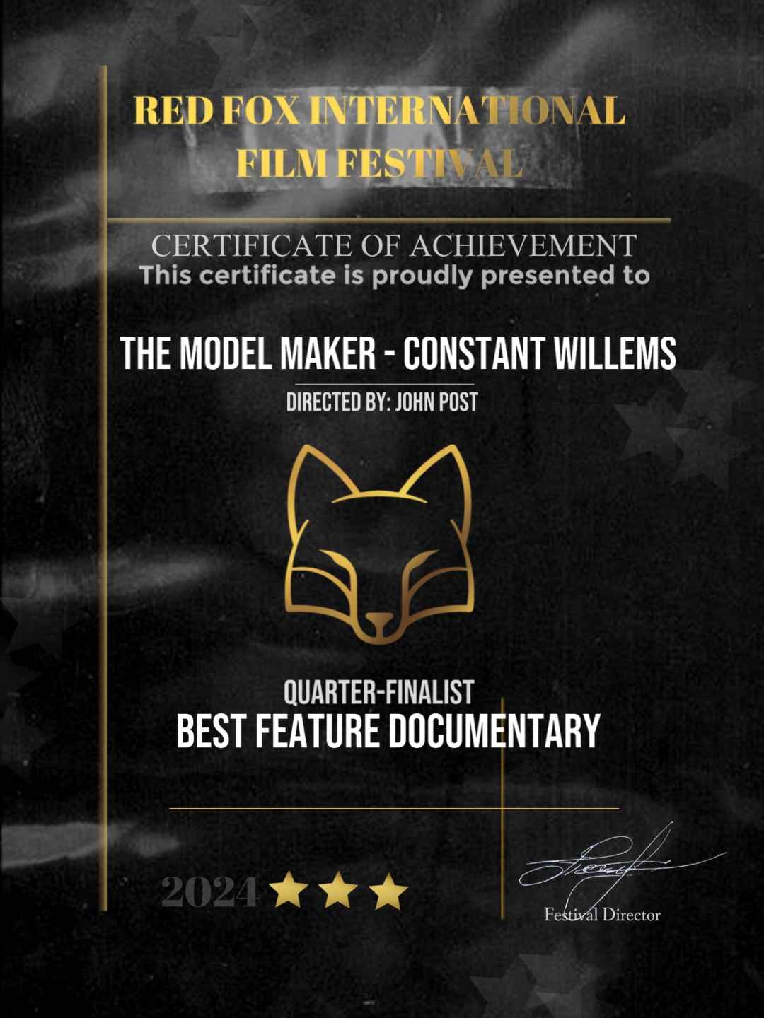 'The Model Maker - Constant Willems' zoals de internationale titel van de documentaire luidt heeft de Kwartfinales behaald op het Red Fox International Filmfestival.